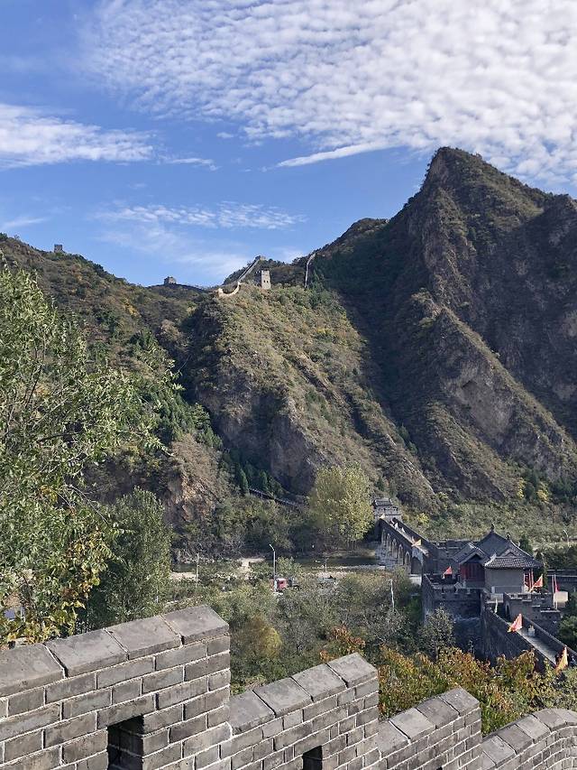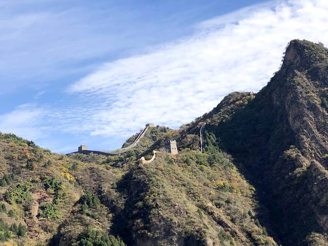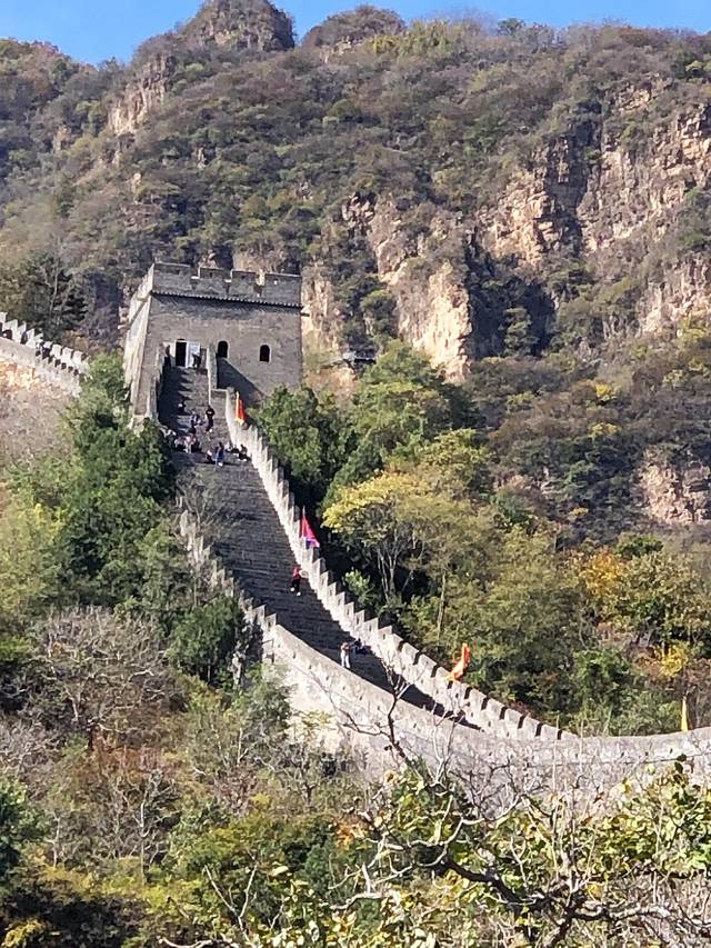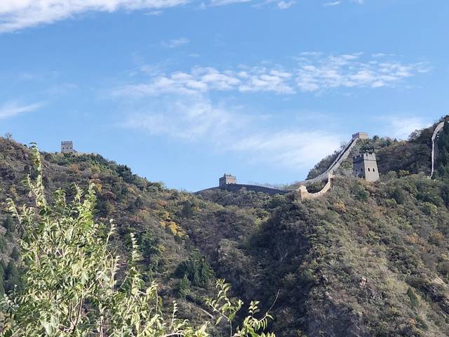 我拿着大双肩包就在第一个敌楼处等着。两边欣赏险峻的黄崖关长城。今天空气较通透,群山起伏黄叶点缀,长城弯蜒其中非常壮观俊秀。
