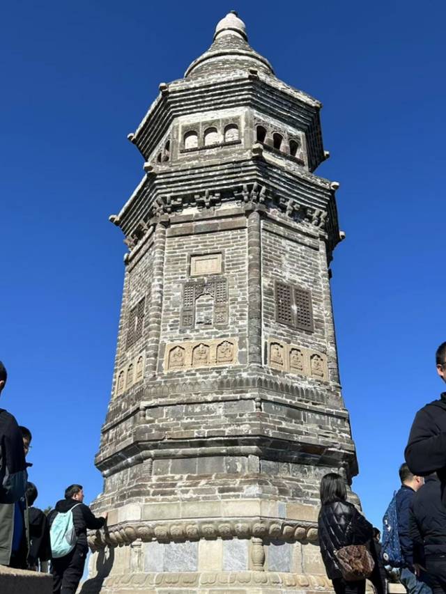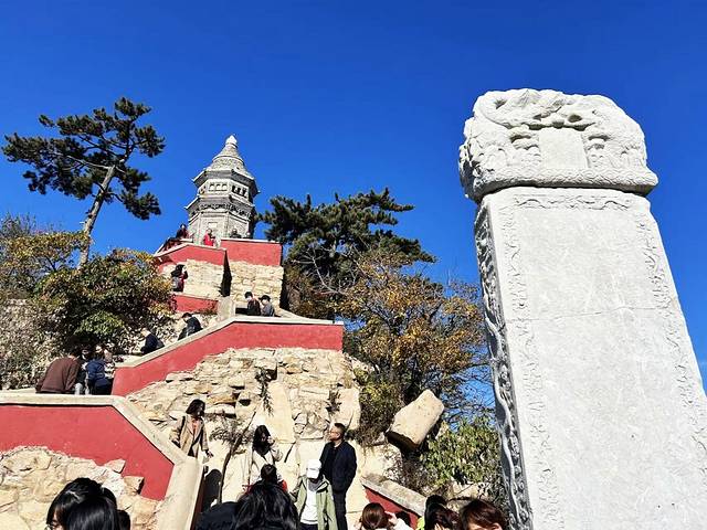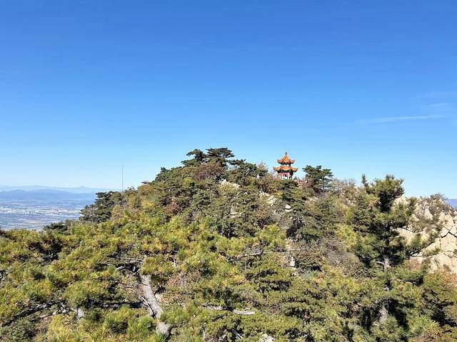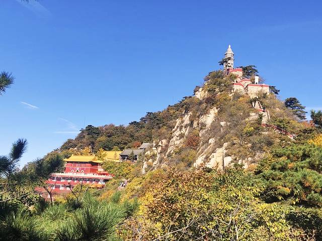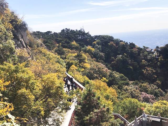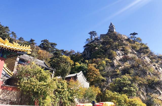 观光车时间较长,基本快到山顶了,挂月索道不长就到了。挂月峰顶有舍利塔,是古迹,还有云罩寺等。山上的树叶许多变了色彩了,站在云罩寺前,山上山下的景色非常美。