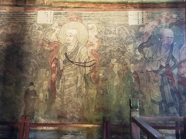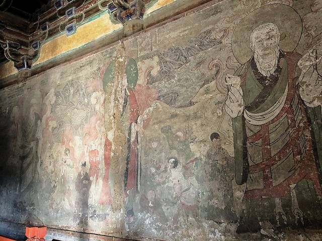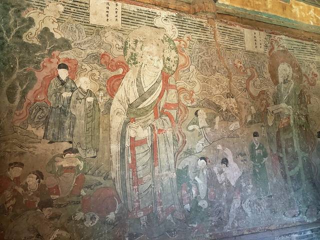 四面墙上的明代壁画还很清晰,内容以十六罗汉和明王像为主题,间绘神变故事、世俗题材及重修信士像,绘画以铁线描为主,兼用兰叶描,线条流畅,为元代绘制,明代重描。