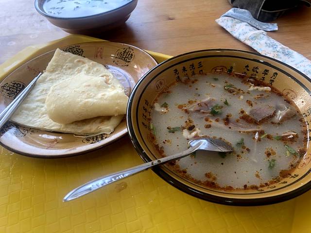 早上8:00多出来找早餐,对面有个羊汤馆,这样的冷天早上喝碗羊汤很带劲儿呀!