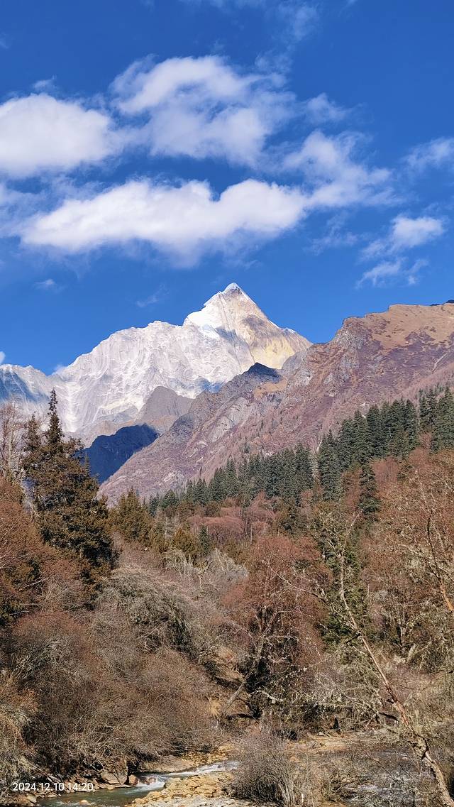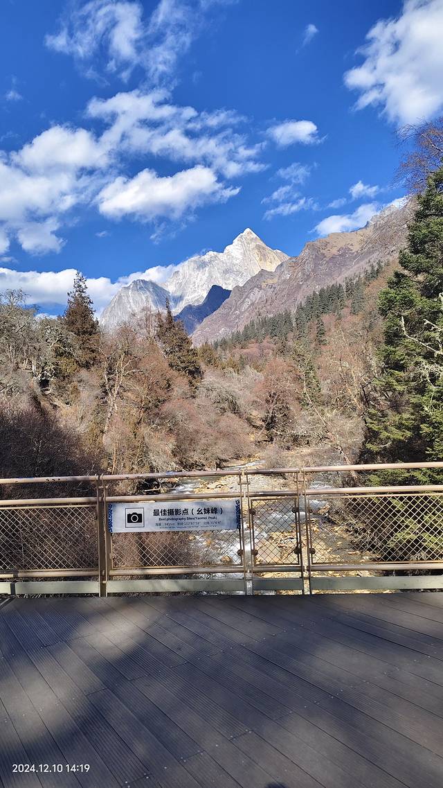 小巴一点多才到入口,售票处可以要一份地图。转观光车到喇嘛寺已经两点多,一下车有点高反我赶紧吃了一口小面包。喇嘛寺回景区入口的最晚一班车是四点半。所以我从喇嘛寺下车一路快速步行加上小跑,中间一路见到返回的人,我见人就问他们从哪回来,有没有马道。结果他们都走的不远。中间还见到两个中东面孔的人,他们说don't understand,然后我竟然随口而出用English ask them,经过一小时终于到了枯树滩,见到两个返回的人到了上海子和下海子,然后给我算了下时间,来不及到下一个点了。这时我已经很喘,高反头疼。但是,枯树滩是第一个绝美风光,可以看到幺妹峰、小滩瀑布。飞湍瀑流争喧豗,砯崖转石万壑雷,这就是了!此时!我想起来昨晚和小孙他们吃饭剩下的一瓶啤酒,于是我正好喝完它补充一下能量,并同时在此绝非风光、世间至美之境中畅咏豪情。