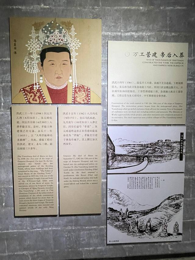 此工程经历洪武、建文、永乐三朝,前后三十多年。风水宝地,龙脉。朱元璋和皇后马氏葬于此玄宫。
