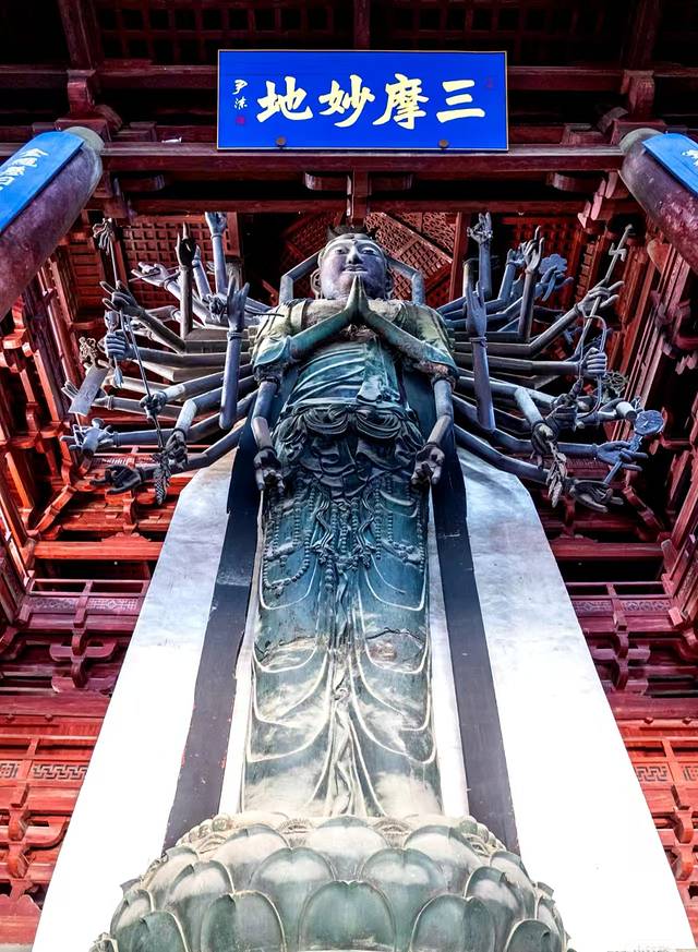 文物原简介:此铜铸千手千眼观音菩萨像为北宋开宝四年(971年)奉太祖赵匡胤之命铸造,像高21.3米,位居我国古代铜造像之首。其42臂中除当胸双手合十外,两侧各20臂呈辐射状分布,手不仅分别执日、月、净瓶、金刚杵、宝剑等法器,且均饰有一眼,以40只手眼配以佛教三界中二十五种果报即为千手千眼之来历,千手表示护持众生,千眼表示观照世间。此像作为一千多年前劳动人民聪明与智慧的结晶,可谓我国古代冶金史上的一大奇迹。在隆兴寺六处文物之最中最具影响力。