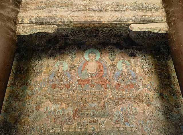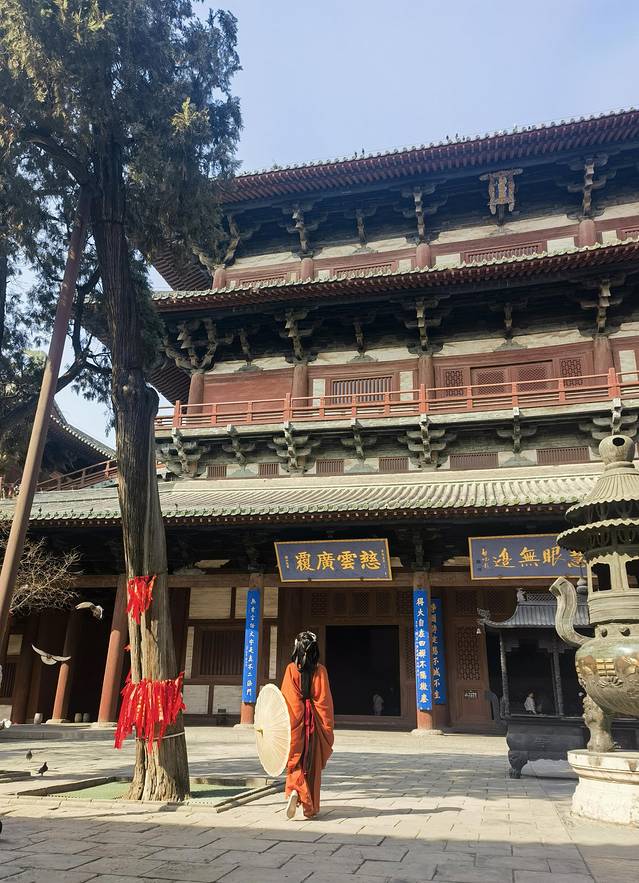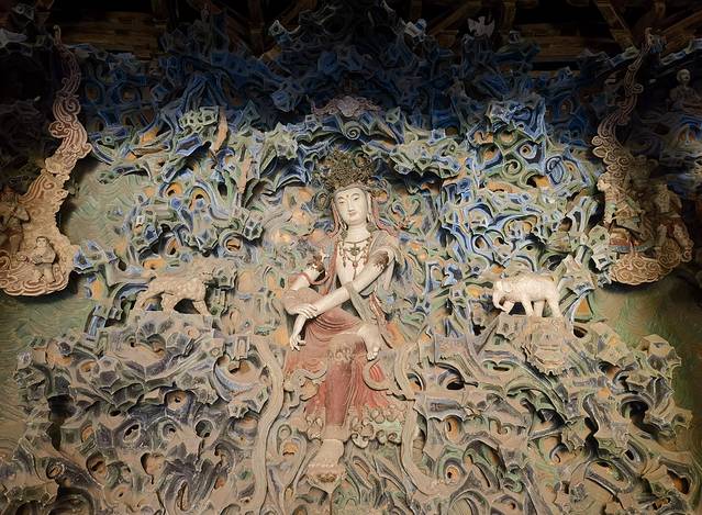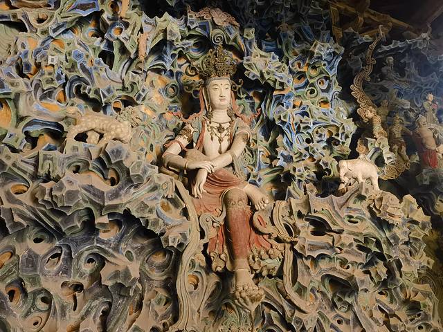 官方介绍:锯坐五彩悬山的正中的观音菩萨,突破宗教佛像的呆板作风,形体曲线柔美,姿态端庄优雅,是诠释宋代观音造像世俗化特点的上乘之作。被鲁迅先生赞誉其为“东方美神”,而且因其坐南朝北,在大殿佛像背面,故称“倒坐观音”。现场看这个坐像特别美,不管从哪个角度看,以至于我看了一遍后忍不住又回转来细细看了一遍,驻足欣赏了很久。