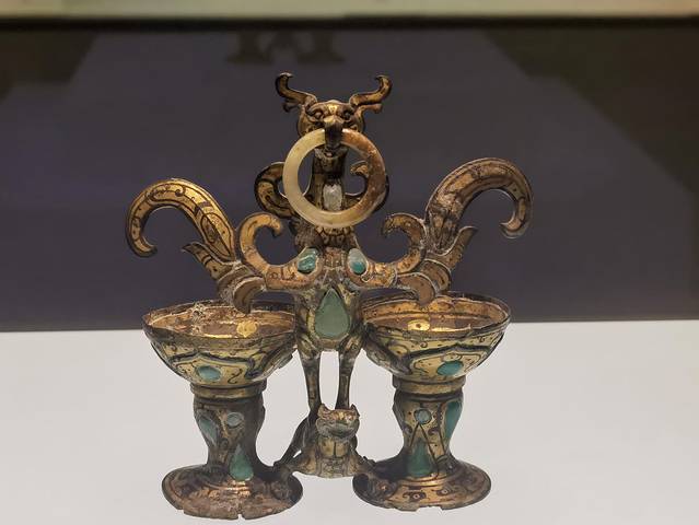 铜朱雀衔环杯,出土时高足杯内尚存有朱红色痕迹,推测是放置化妆品的奁具。