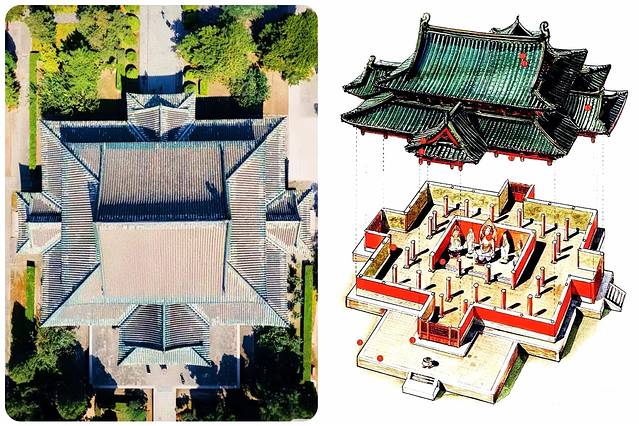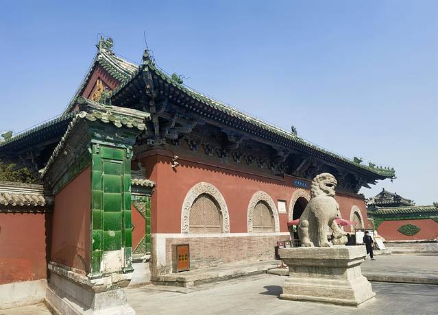 摩尼殿始建于北宋皇祐四年(1052),屋顶为重檐歇山顶,大殿布局奇特,正方形殿身四面正中各出一山花向前的歇山式抱厦,使平面形成“十”字形 ,基本结构和风格依然保留了宋代《营造法式》的精髓。