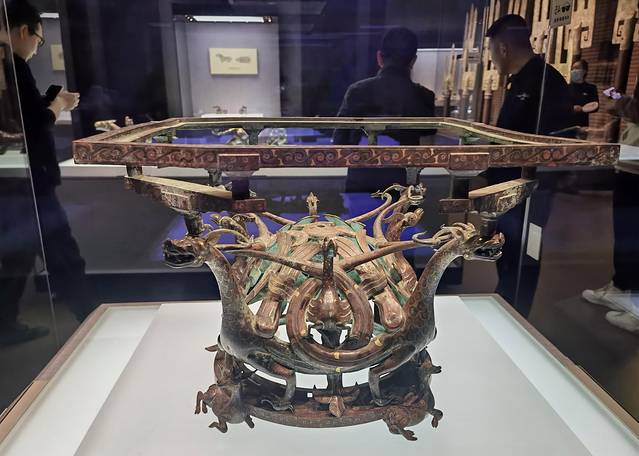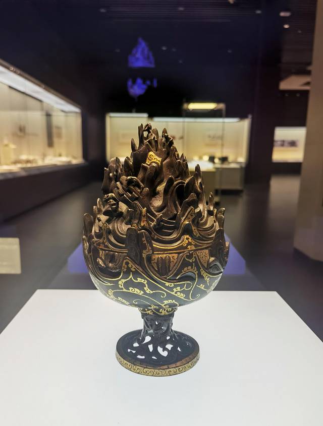 错金铜博山炉。底座透雕出三龙出水状,龙首顶托炉盘。炉盘装饰以错金流云纹。炉身铸出峻峭起伏的山峦,山间神兽出没、虎豹奔走,小猴蹲踞在高层峰峦或骑在兽身上,猎人巡猎于山石间,人与自然和谐一体。当炉腹内燃烧香料时,烟气从镂空的山形中散出,有如仙气缭绕,给人以置身仙境的感觉。