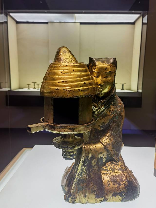 西汉长信宫灯,1968年于中山靖王刘胜妻窦绾墓中出土。宫灯灯体为一通体鎏金、双手执灯跽坐的宫女,长信宫灯设计十分巧妙,有超前的环保设计,宫女的左手托住灯座,右手提着灯罩,右臂与灯的烟道相通,以手袖作为排烟的管道。灯罩由两块弧形的瓦状铜板合拢后为圆形,嵌于灯盘的槽之中,可以左右开合,这样能任意调节灯光的照射方向亮度和强弱。此宫灯因曾放置于窦太后(刘胜祖母)的长信宫内而得名。