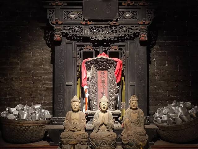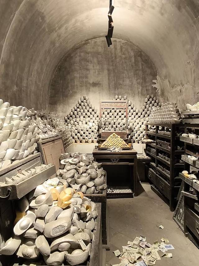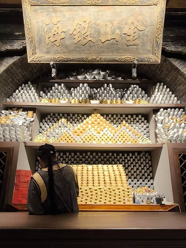 最值得一看的是地下金库,现在是全国唯一开放的最大的地下金库,据说曾经藏着几百个小目标的金银。协同庆地下金库位于平遥古城协同庆票号旧址,在古城的中心,被认为是风水最好的地方。规模宏大,能装下300万两黄金,相当于现在300亿元人民币,由十间窑洞组成,建筑面积200多平方米。入口隐蔽,通过狭窄楼梯和通道进入,通道有金色灯光,营造出金碧辉煌的感觉。有龙柱,名日“定海神针”,据说位于平遥县中心,代表财运。还有武圣关羽雕像,作用与门神一般。这里还有中国第一个提款机的起源故事,“提现”二字由此而来。
