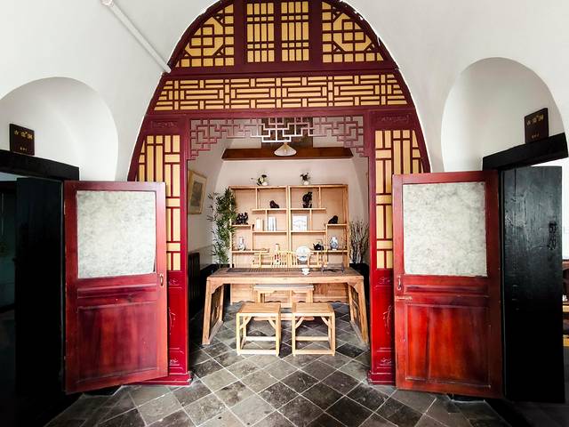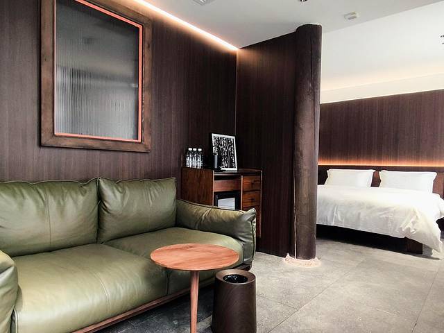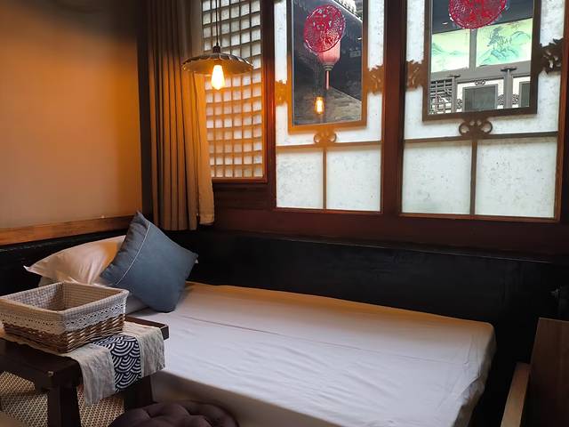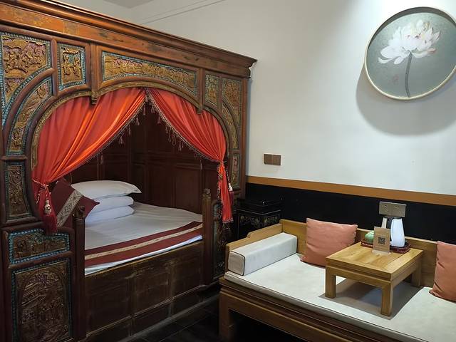 评价:距离县衙非常近,出门右拐2分钟可达。是一座具有明清古建筑装饰风格的两层木质小楼,灰墙青砖,木窗雕饰,古色古香。院子里有竹编式沙发、茶几和秋千,晚上大红灯笼亮起,很有氛围感~房间类型很多,有土炕房、龙凤床、影音房等,每个房间名字不同,里面的灯、挂饰和摆设都各有特色,细节满满