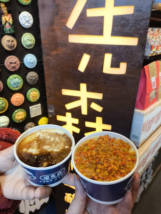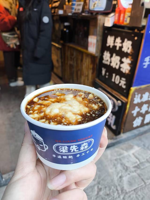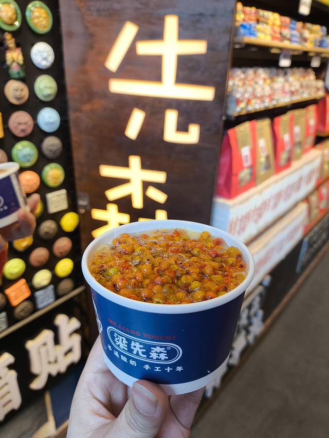 老陈醋酸奶:一种山西特色食品,酸奶的酸味柔和,还带着浓郁的奶香味;老陈醋的酸味则比较锐利、清爽,且有明显的醋香。两者融合,酸味相互交织,产生一种独特的、层次丰富的酸甜口感~同样是梁先森酸奶的原创招牌之一