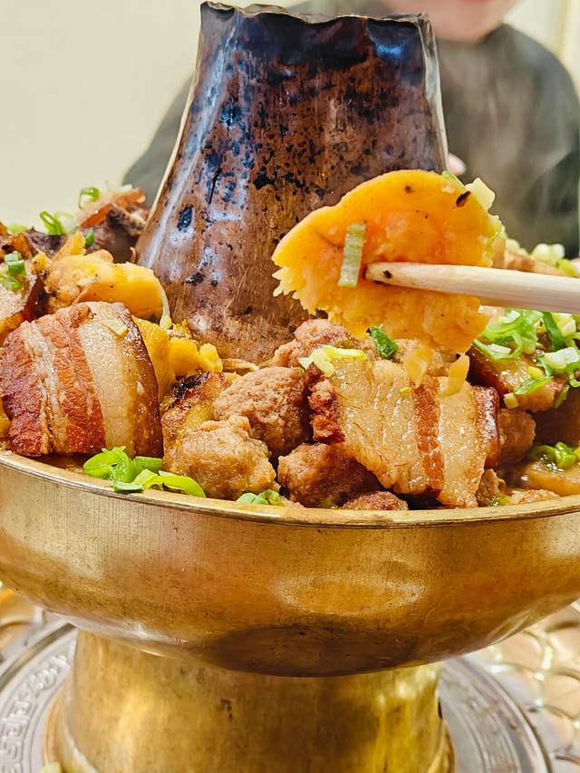 什锦铜火锅:肉和菜均匀分布,碳火炖煮更香,适合冬天,各种食材在铜锅里咕嘟咕嘟冒着热气
