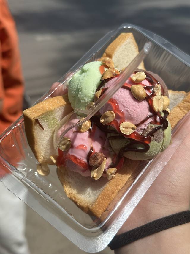 吐司🍞冰淇淋:🍞很松软上面铺了一层薄薄糯米饭🍚,选了抹茶🍵巧克力🍫草莓🍓柠檬🍋给了五个球,超级无敌划算,冰淇淋味道很浓郁,不是粉兑的,是纯正的味道,配上吐司,中和的恰到好处.