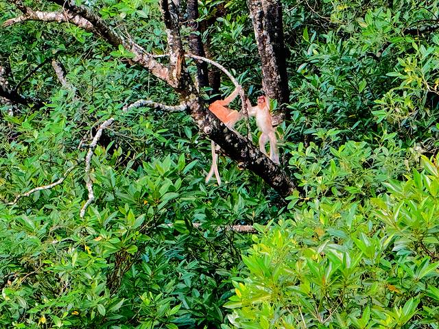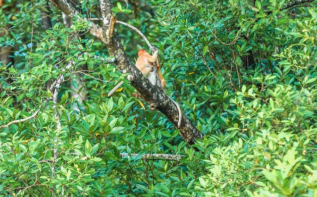 马来西亚国宝长鼻猴长鼻猴是世界濒危保护动物,总数只有几千只。因为鼻子大得出奇,所以称其为长鼻猴,其中雄性猴子随着年龄的增长鼻子会越来越大。我们来到kawa 红树林的河域,开启乘船发现长鼻猴一个种群里面只有一只雄性长鼻猴,我们的船只绕了一圈俨然发现了一群长鼻猴,还幸运地遇见了大鼻子公猴悠哉地吃叶子。
