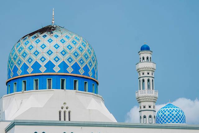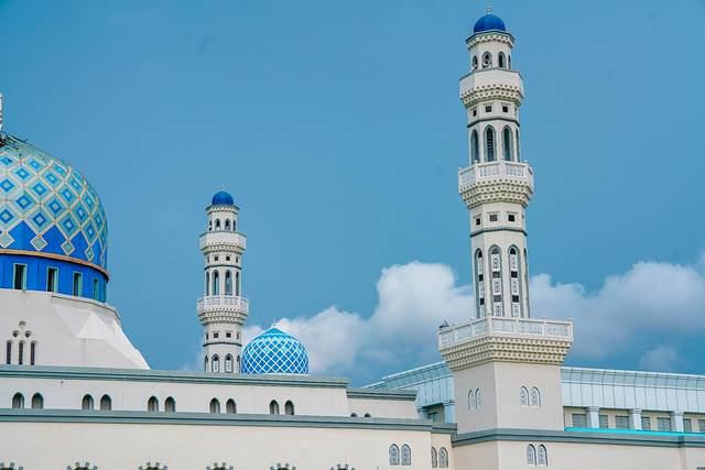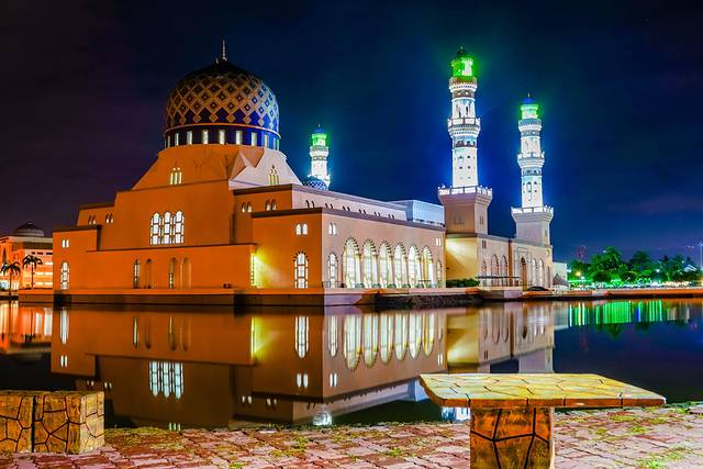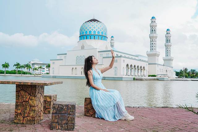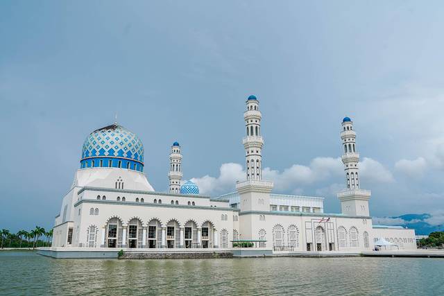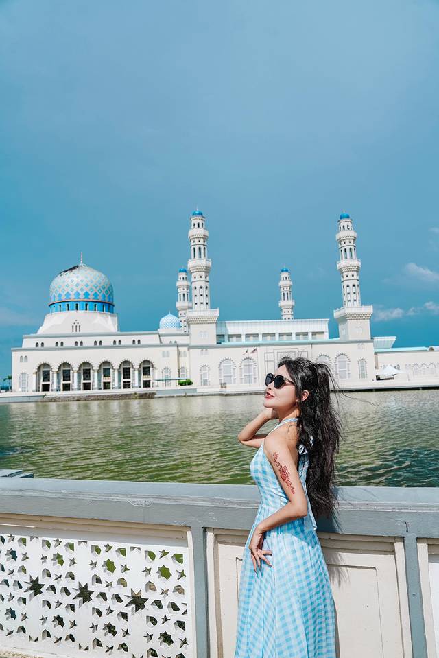 来到水上清真寺建筑风格独特,坐落在水面之上,白色的建筑在阳光下显得格外圣洁庄严。