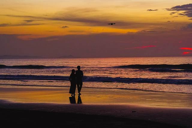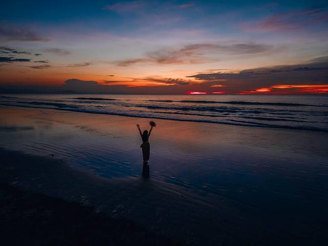 海水渐渐褪去,夕阳慢慢显现,余晖漫天。它惊艳我的是太阳将天空晕染出不同色彩,由金转黄,在变成蓝,最后呈现粉紫一片,浪漫得让人想留下每一帧画面。