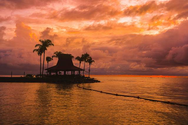 在亚庇看日落完全需要勇气,早上天晴但可能到了午后便开始下倾盆大雨,海岛天气实属奇怪。亚庇的日落观看点主要有两个。丹绒亚路海滩和香格里拉的日落吧,这次选择的是来到香港里拉的日落吧