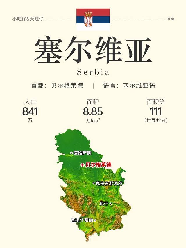塞尔维亚国土总面积为8.85万平方公里,其中包含科索沃地区的1.09万平方公里,总人口为841万。