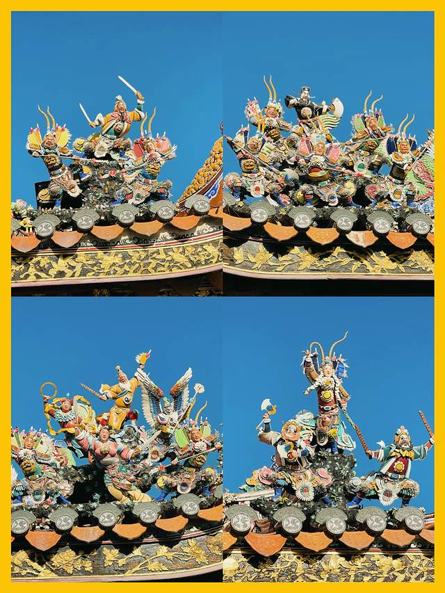 潮州的各大庙宇中青龙古庙的建筑水准堪称天花板,是潮州的工艺技术之巅。特别是屋顶,太惊艳了,斑斓精致的嵌瓷艺术,栩栩如生的人物形象,色彩明艳的视觉冲击、堪称一绝。庙内木雕、石雕工艺都很有工匠精神,是潮州民俗工艺的典范。