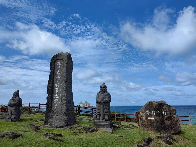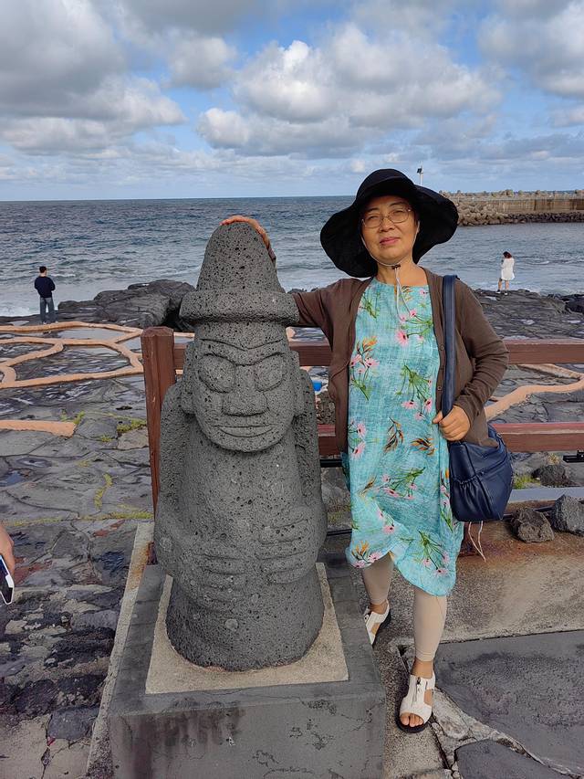 济州岛上有许多石头雕塑,韩国人称“老爷爷”,双手捂肚子,文官左手高,武官右手高。