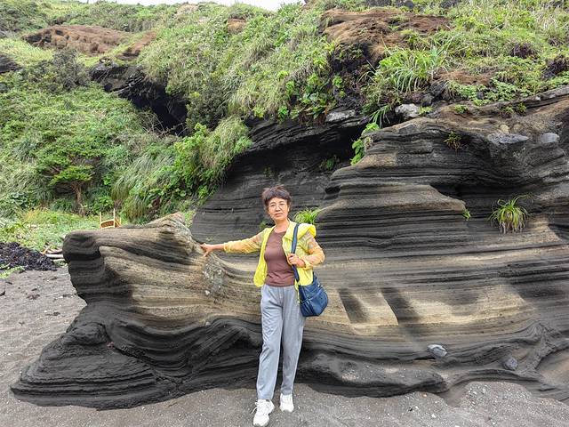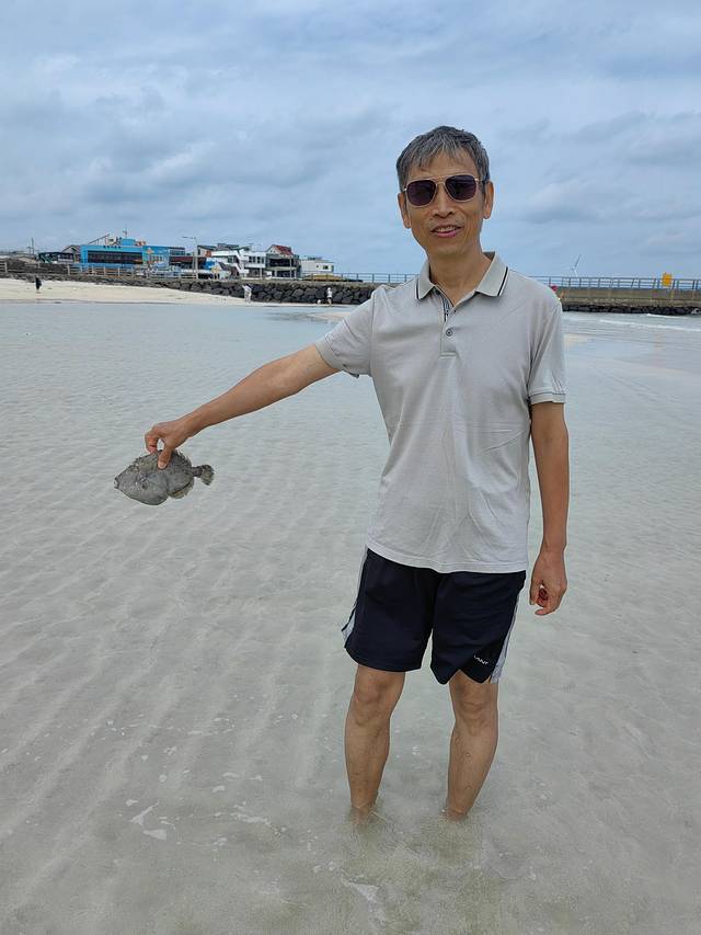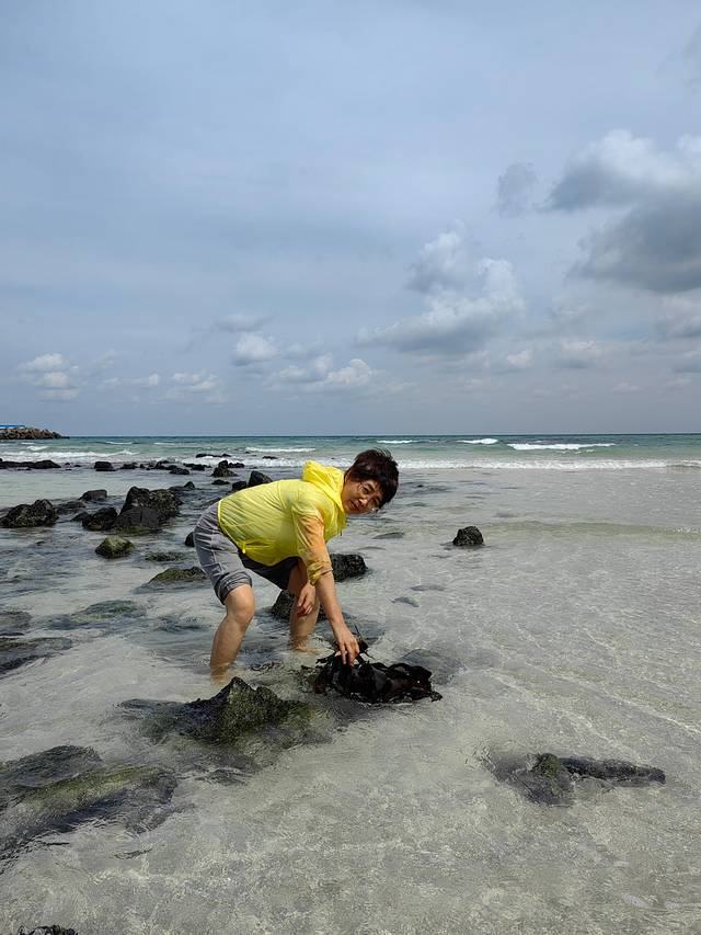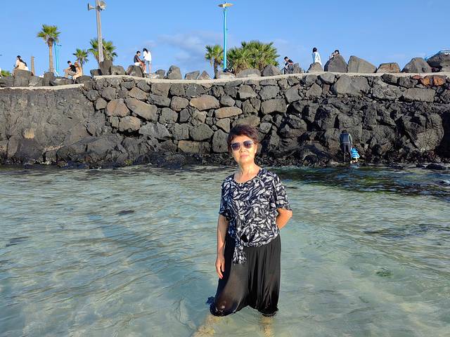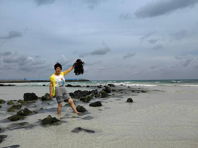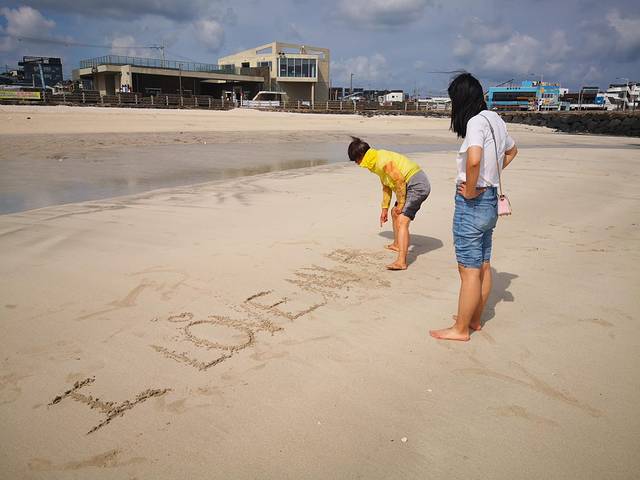 官名“咸德海水浴场”我们习惯叫做咸德海滩,这里有沙滩、沙雕,海浪不大可以下海游泳。济州岛是个火山岛,火山喷发留下黑色有孔洞有棱角的熔岩——玄武岩,我女儿脚踩石头还划破了脚。