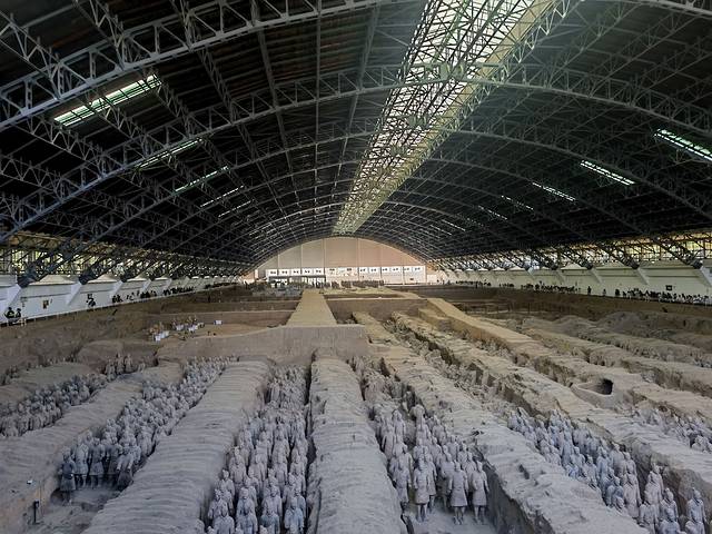 秦始皇兵马俑博物馆包含一、二、三号坑遗址等,当时去的时候还有特展,但是由于带着老妈,步行太多又很累,走完一号坑就提前出园了。一号坑,为东西向的长方形坑,长230米,宽62米,目前约埋藏有6000件陶俑和陶马,同时还伴有大量的青铜兵器。去的时候一号坑参观的人不算多,能顺利的站在围栏旁听讲解,整体和十年前没有什么大变化,远观坑里好似就是一堆土人,实际是形态各异、千人千面的武士。