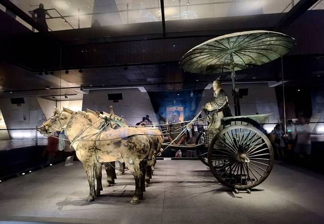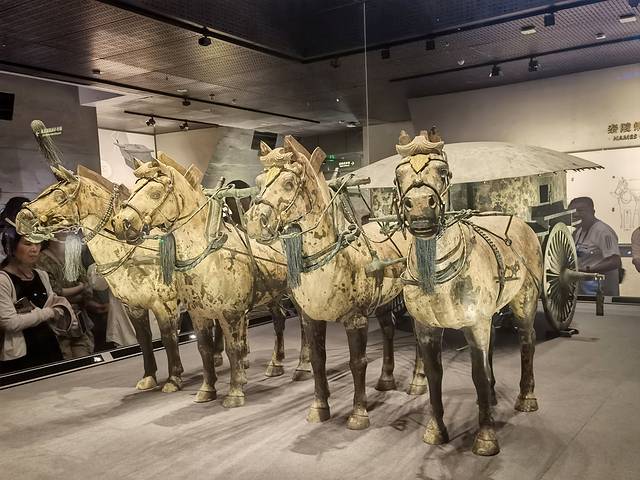 我们先去的丽山园,丽山园有百戏俑坑(k9901展厅)、铜车马展厅、文官俑坑(k0006展厅)几个点,最值得一看的就是铜车马。丽山园景区巨大,一定要购买电瓶车票,不建议步行。十年前去西安的时候,我记得景区是没有分两个部分的,就专门问了导游,导游说铜车马以前确实是放在秦始皇兵马俑博物馆的,那时虽然人多,但是文物比较集中,观赏性较好。现在分到两个景区,确实有点累人,尤其带着老人出行很不方便。秦始皇帝陵目前就是一个小山丘,还没有被开发。百戏俑坑可以欣赏到秦代宫廷的大力士、杂技表演陶俑等。丽山园重中之重当然是看铜车马,秦铜车马一组两乘,两乘车出土时破碎成几千片,经过文物专家近8年的精心修复,1989年才正式陈列展出。两乘铜车马一为“立车”,一为“安车”,均为古代单辕双轮车,并按秦代真人车马约二分之一比例制作,由3500余个零部件用铸造、镶嵌、焊接、子母扣连接、活铰连接等多种工艺组装而成。秦铜车马是中国考古史上出土的体型最大、结构最复杂、系驾关系最完整古代车马,被誉为“青铜之冠”。现场看还是惊叹不已,两千年前的匠人可太智慧了,没有现代技术的辅助,能创造如此精细的艺术品。幸好我们提前预约了一个讲解,更能全面深入的了解文物的精彩之处。