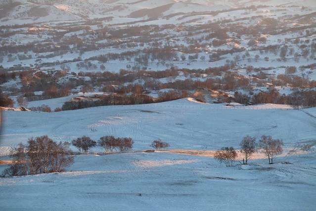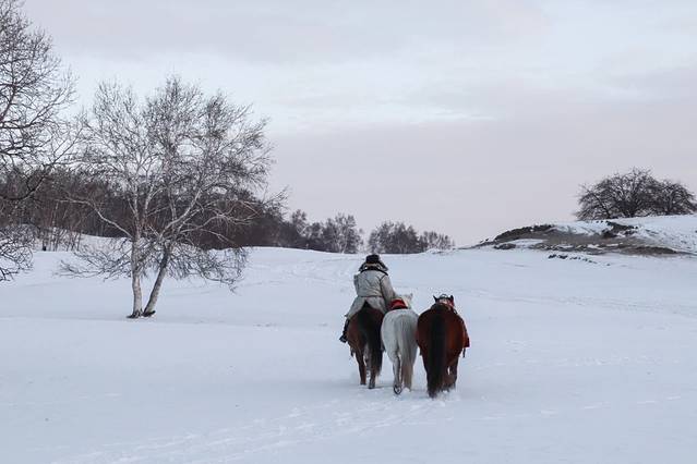 白天的冬季草原一片纯净,越野车在这一大片的雪白里上坡下坡,一直向前,我们像是一群误入圣地的人,颇为治愈,我的困意完完全全地褪去了,连心里的疲惫都被清洗干净。