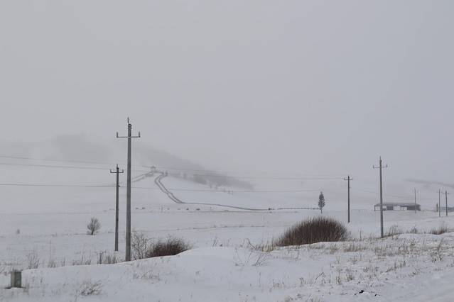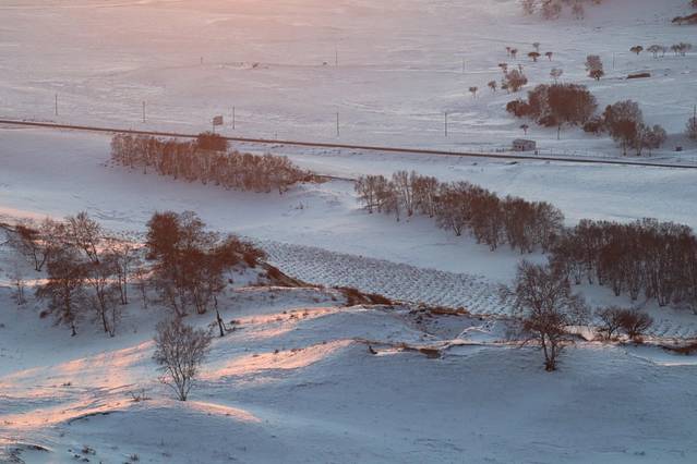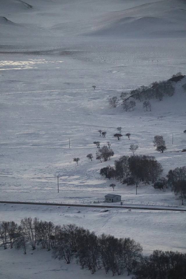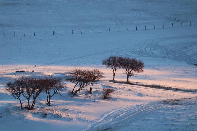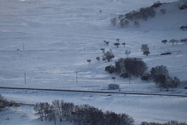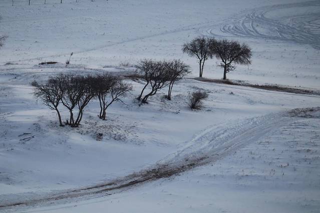 这一场没有碰上好运气,乌兰布统的温度还不够低,树上只轻飘飘地挂着一点点雪,看不出来是雾凇。汹涌的困意继续袭来,也没有期待的雾凇,车外还冷,还没缓过来的我于是选择了抱着同样没缓过来的机器默默待在车里。