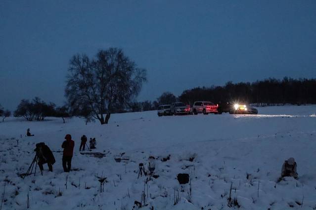 熟练地爬上山坡找好机位,就和身边的摄影师们一起等待日出了。冬季的草原,一切都被罩在雪白里,外加一点黑色,日出之前,远处的每一个画面框起来都像是一幅水墨画。