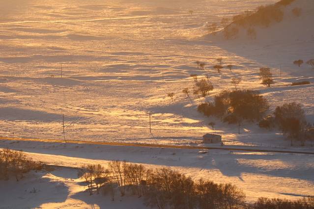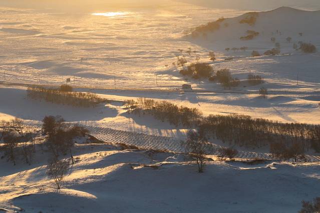雪地被染成金色,不是晃眼的金色,是朦胧的含蓄的让人看一眼就知道是晨曦的金色。这隐隐约约的美感,我又词穷了。