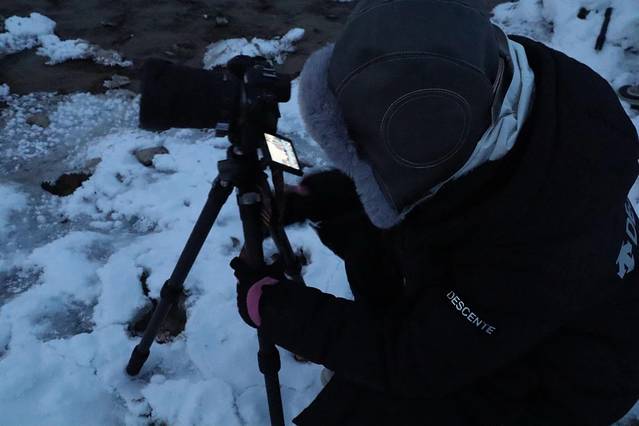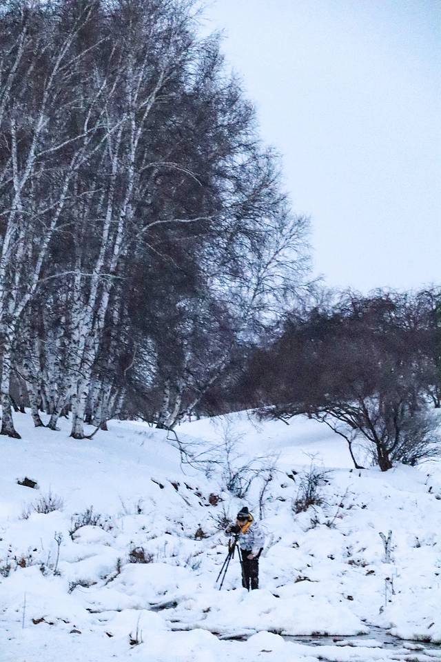不知道是人在极寒的条件下不爱说话,还是大家都更专注于拍摄无心交流其他,我们这群人在雪地里守着自己的方圆几米,所有人架好自己的机器后,又拿起另外的相机四处走动拍拍,或是飞起无人机。