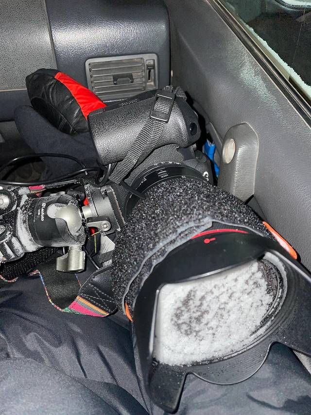 机器在外面冻了一晚上,镜头和机身都结上了冰,我小心翼翼抱着,生怕把此刻无比脆弱的相机摔了。在外面小待一会儿而已,我的帽檐上和口罩边缘就全是呵出的热气结成的冰。