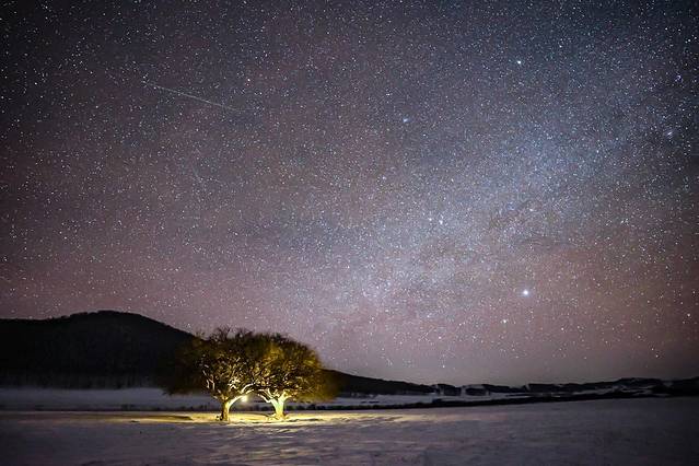 昨天拍了一次星空有了经验,等张哥走到夫妻树那里挂好灯点亮地景后,我迅速地设置好了参数,调好了角度。也实在尝过了零下30度的冷,确认机器不会出问题后我就很快缩回了越野车里。