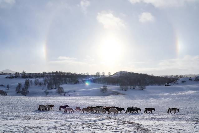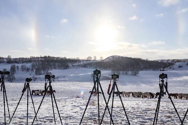 马群正在我们对着的前方养精蓄锐,此刻冻得有些瑟瑟发抖的我真是好奇,不知道马会不会觉得冷。我踱着小步子守在自己的机器后面,一抬头,看到天上竟形成了一圈没有闭合的圆形日晕!太美了!