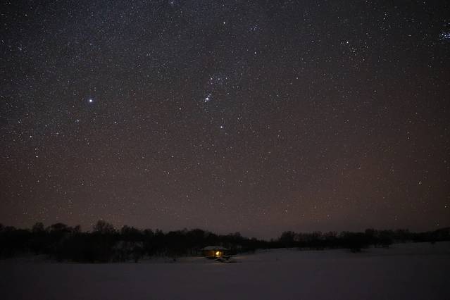 拍星空的机器背对着在冰湖上架了两排,一排的镜头对准了猎户座,另一排对准了背面的北斗七星。我好久没看到这么干净的夜空了,漫天的繁星在头顶闪耀,还有一群看星星和追星星的人,脚下是纯净的冰面,真好啊。我不时地昂起头盯着星空看好久,脑子里一片空白,惬意极了。