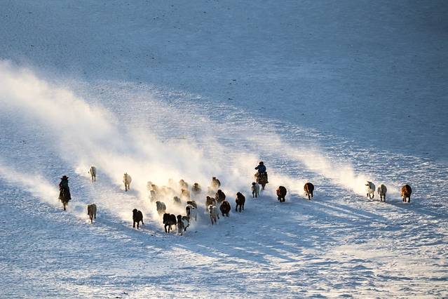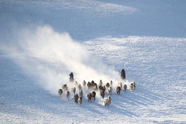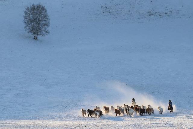 光线确实特别给力,马从对面山坡上冲下来的时候,恰好经过一片阳光照射的区域,马蹄踏起来的雪花飞进光里,拖出长长的弧线,像从天宫奔来的马。
