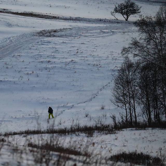 我拿着另一台焦距更长的相机对准远处拍了起来,听到身边人都在喊着看远处路上走着的人。我也拉远镜头瞧了瞧,居然是我们队伍里的人,不知道是掉队了还是刻意跑到老远的路上去拍东西。“有人打趣:等他一会儿走到我们这,我们估计都收机器回去了。”整条路上只有他一个人,足迹清晰地印在雪上,还挺好看。
