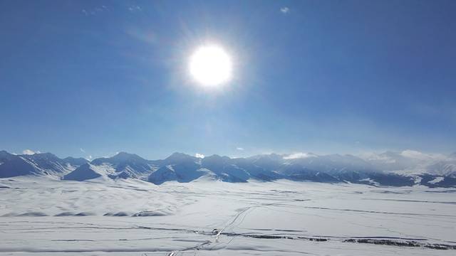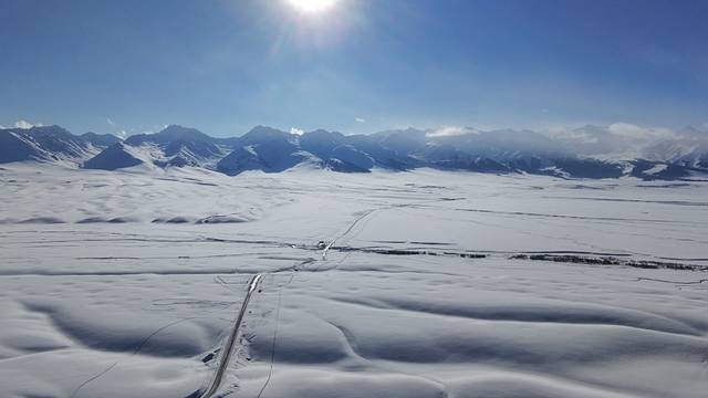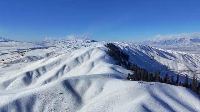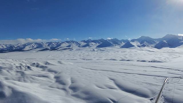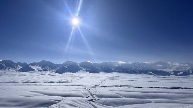 站在草原入口,極目遠眺,連綿起伏的山巒像是被大自然精心雕琢的巨型藝術品。往日翠綠的峰嶺,此刻皆被厚厚的積雪覆蓋,潔白無瑕,恰似一條蜿蜒的玉龍,蟄伏在大地之上,於陽光的輕撫下閃爍著清冷的光芒。山頂的雪松,身姿挺拔,掛滿了沈甸甸、毛茸茸的雪淞,微風拂過,雪屑簌簌飄落,仿若碎瓊亂玉。