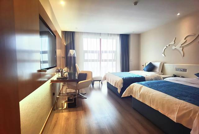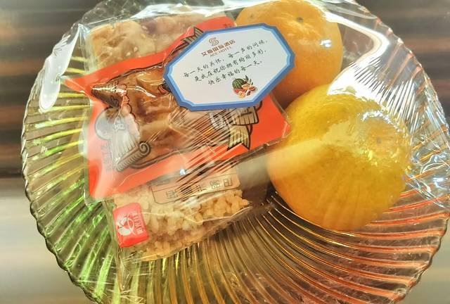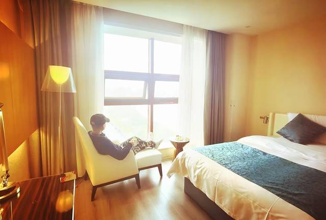2、环境好。酒店环境优雅时尚,整体设计简约温馨,服务也不错,客房内有欢迎水果和小食,前台还会给予免费升级房型,躺在床上就可以看日出和夜景,是一大亮点,非常适合懒床专业户,既可以在床上扎根,又可以看日出,两不误多爽!尽管天公不作美,阴天天气让我们没有瞅着东升太阳,但那种懒在1.5米大床上的舒适感享受到了。
