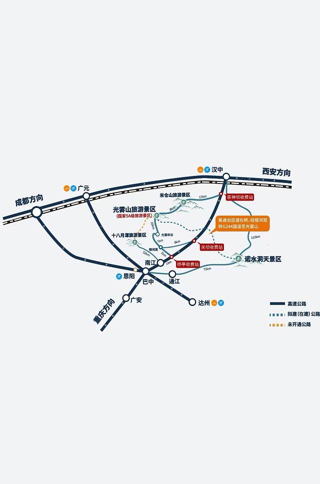 1、公路出行。①上海直接自驾。若从上海S32嘉闵高架路收费站(入口)出发,最省时省钱到达目的地的自驾路线:S32嘉闵高架路收费站(入口)→申嘉湖高速→长深高速→沪渝高速→宣城绕城高速→沪渝高速→沪武高速→福银高速→十天高速→京昆高速→银昆高速→喜神坝收费站(出口)→244国道→红军西路→244国道→光雾山旅游景区游客中心停车场,途径上海、浙江、安徽、湖北、陕西和四川6个省市;沿途高速共有40个服务区,其中:有35个服务区可加油、有33个服务区可充电、有35个服务区可餐饮,出高速后的红军西路中段为盘山公路;这条路线全长约1676公里,全程用时约17小时44分钟(不含临停休息),买路费约¥890.00元。