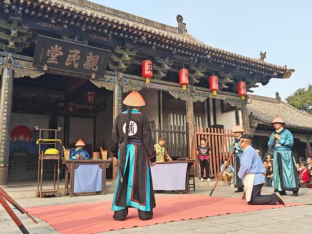 参观县衙中的一个定点节目就是每天亲民堂的县太爷升堂断案表演了,通过表演展现了古 代县 衙的办公场景和司法程序。在表演中,你可以看到古 代县 衙的建筑和陈设,了解县衙的职能和运作方式。表演通常由工作人员扮演县太爷、衙役等角色,重现升堂断案的过程。县太爷会坐在大堂上,处理各种案件,包括民事纠纷、刑事案件等。衙役们则会执行县太爷的命令,维护公堂秩序。表演从堂前敲鼓开始,到提审犯人,最后断案升华。一天不同场次的故事也不同。总体来说表演有笑点,有互动,很值得一看。