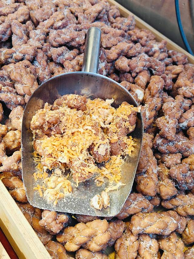 偶然在街边看到的小店,尝过之后果断买了好几袋!11种口味的小麻花真的爱了,原味、海苔、牛肉、香辣、蜂蜜、红糖、肉松……尤其是肉松口味的我的最爱,小麻花上面裹了满满的肉松,微甜,特别香酥!还有 平遥 人过年都要吃的油花花可以尝试一下,特别酥脆,适合带给家人,一致得到了家人的喜爱~