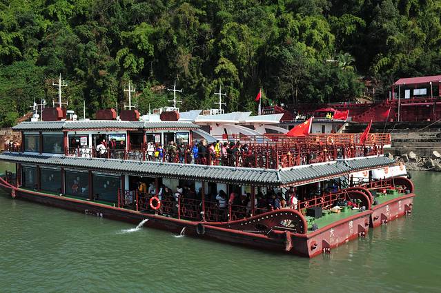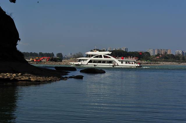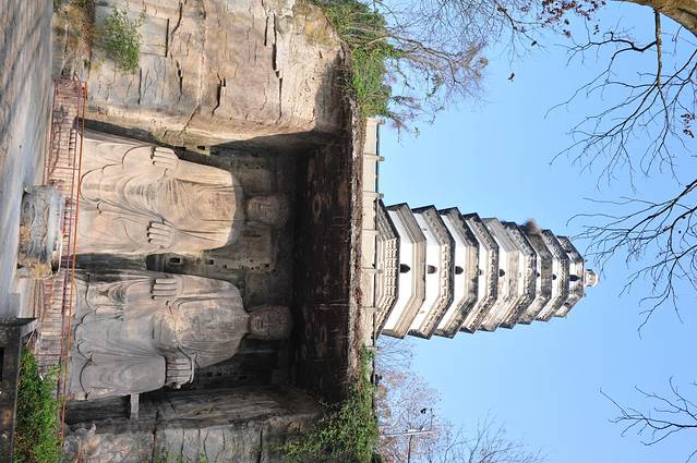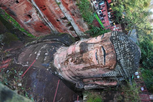 乐山大佛始于唐开元初年(公元 713 年),完成于唐贞元十九年(公元 803 年),建造历时约九十年。地处岷江、青衣江、大渡河三江交汇处的岩壁,坐东向西,依山临江开凿而成。全身长达 4000 余米,头由乌尤山构成,凌云山峰峰相连构成身躯,翘起的龟城山构成佛足。我们由北门进南门出。出门后坐人力车到游船码头,在船上一睹乐山大佛的全貌。