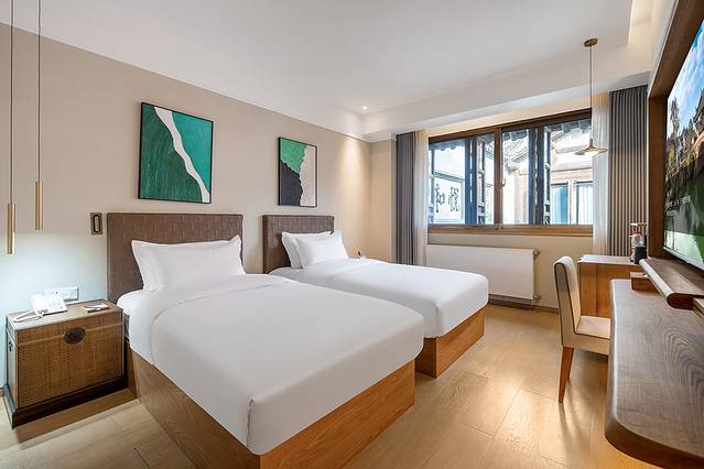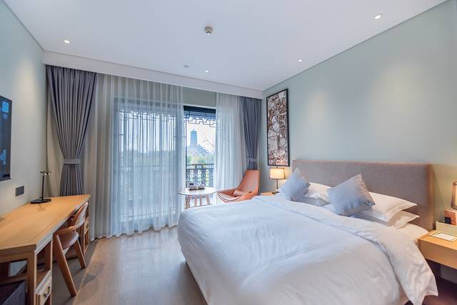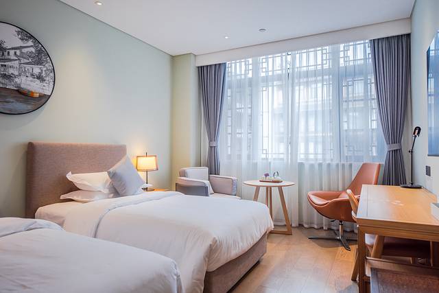 濮院景区新开业直营酒店,定位豪华高端,客房及餐饮软硬件设施 桐乡 一流,2024必住榜;古镇入口对面,地下车库停车方便;景区游览出行便捷!酒店平面是“△”建筑,每房都带窗户。一楼大堂左右连通,视觉通透感极好,空间感很强;大门正对中庭,就是古朴典雅休息区。各楼层温度暖和,大堂左侧是茶吧和VIP接待区,右侧是前台,东西两侧客房电梯都通向自助餐厅。