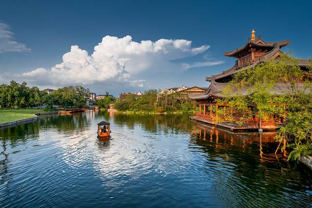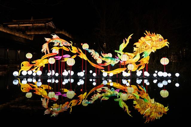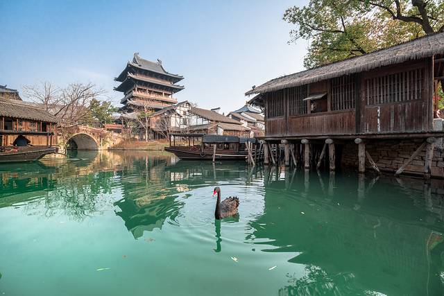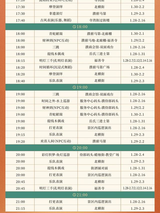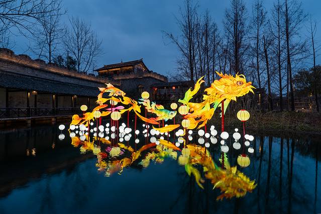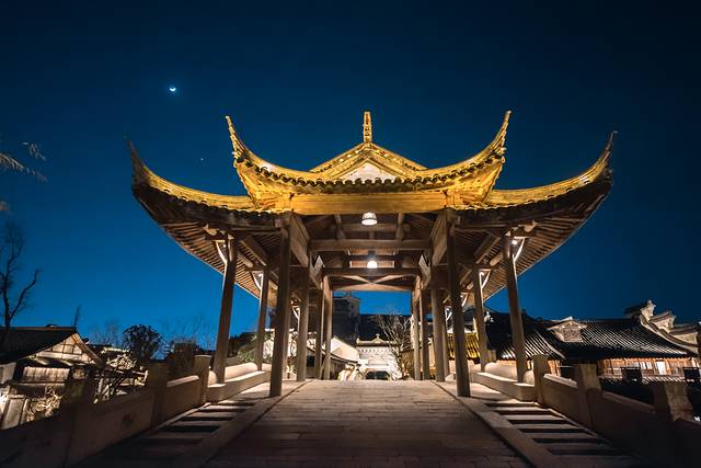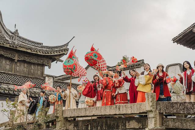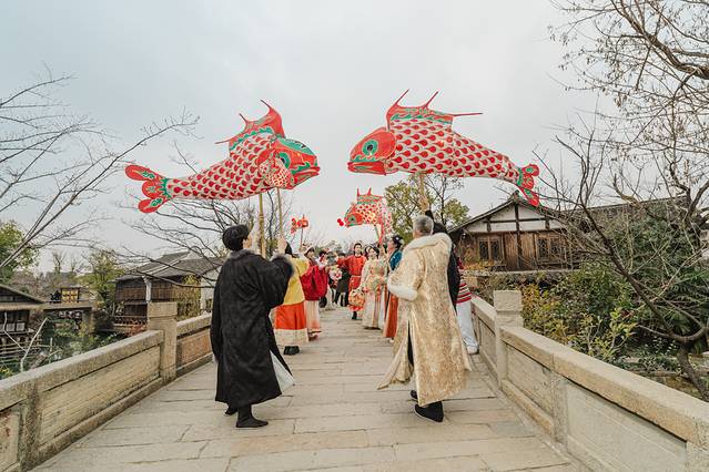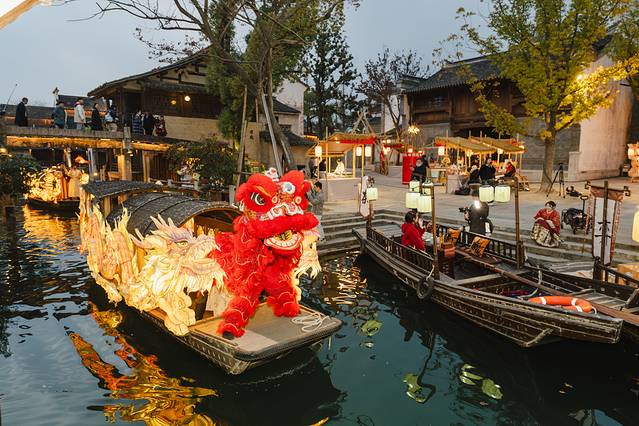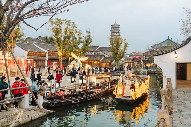 4)白天热闹,夜晚景美。春节期间,从早上9点到21点,70余场次演出不断。白天游客多,春节氛围浓郁。夜幕间华灯初上,暖白光映衬出 江南 水乡古镇的轮廓美、倒影美,花船划过水面,非常出片。夜间游客少,尤其还有提灯走桥祈福善巡游、无人机孔明灯,更是将宋韵 中国 年的氛围推向高潮。第二天早上,还可以去赶个烟火气早市,无论北更楼或是寺湾街宋街晓市。