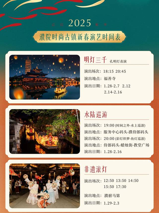 如今复旧福善寺塔,遵循史实记载,成为重大时尚活动的主会场。多部古装聚集、连续两届濮院时尚周就在这举办。新春之夜,还有无人机孔明灯在寺院中腾飞,游客朋友不可错过。1月28日~2月7日、2月12日、2月14日~2月16日,演出场次分别是18:15、20:45。