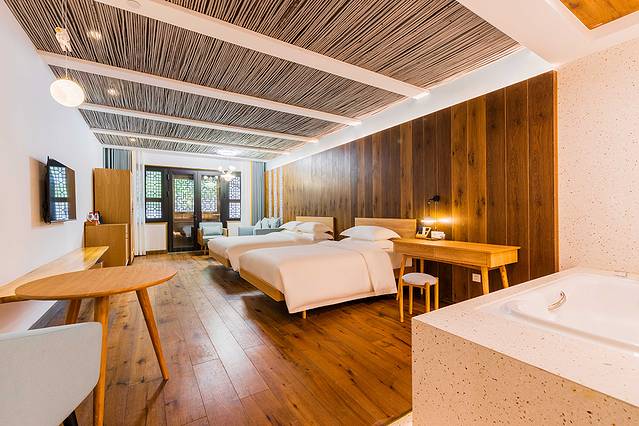 西·古井客栈:紧邻鸽子楼,门前特色小吃很多,汤锣饼、咀香臭豆腐、濮院果屋、蚬子滩小酒馆近在咫尺,尤其离景区景交车必经站点很近。蚬子滩门楼打卡点不可错过。院景、街景房为主。