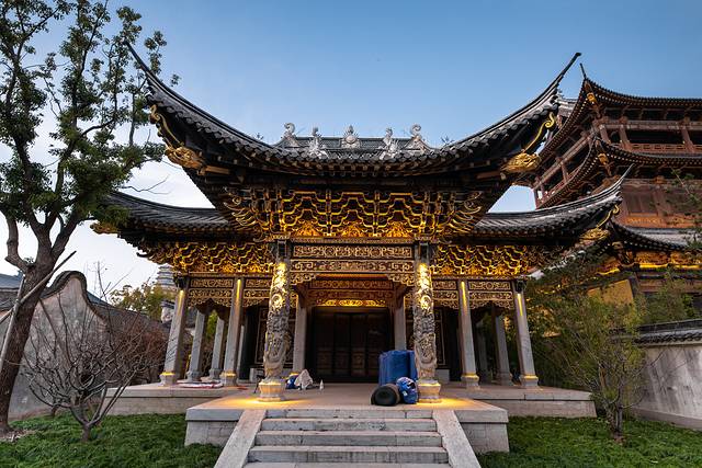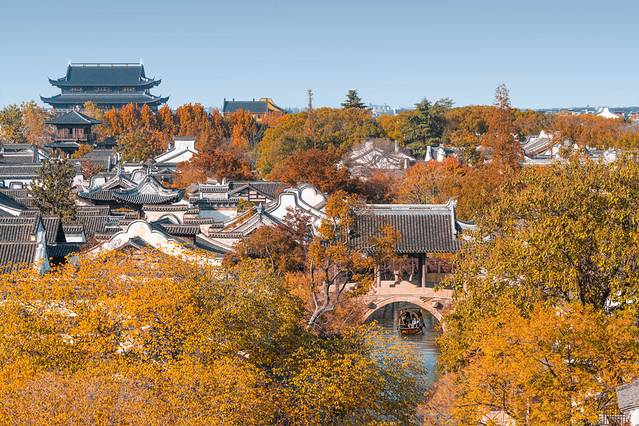 驻足庙前广场,特别庄重威严。福善寺为实木结构,黄墙红瓦,晨钟暮鼓,是濮院标志性的人文景观。寺院后福善塔,古镇最高建筑,电梯可直达5楼,这里俯瞰濮院全景最佳机位,尤其日落和华灯初上时刻,建筑星罗棋布、鳞次栉比,很惊艳。此外景区之中拍福善塔的角度有很多, 比如 寺湾街侍郎客栈拴马桩、庙前广场御桥东侧、禅茶一戏客栈二楼、北更楼城楼、游客中心码头等。