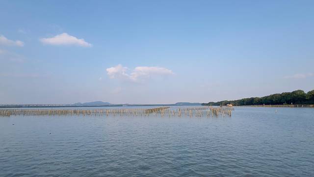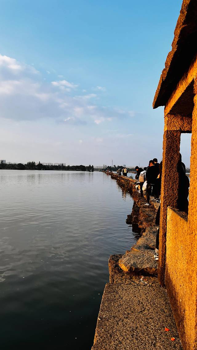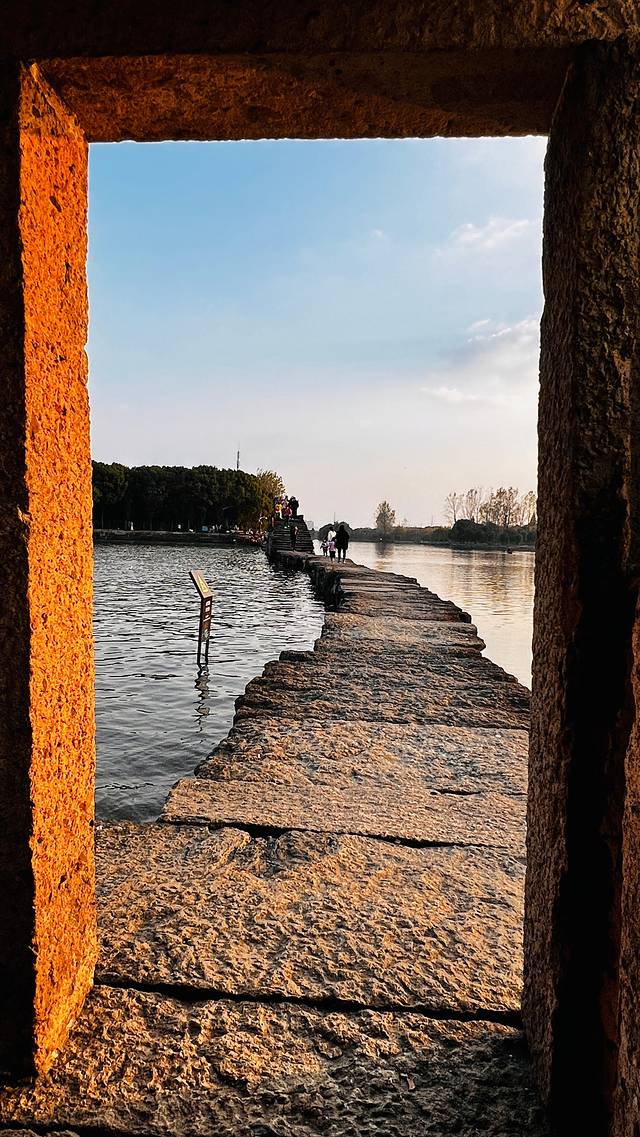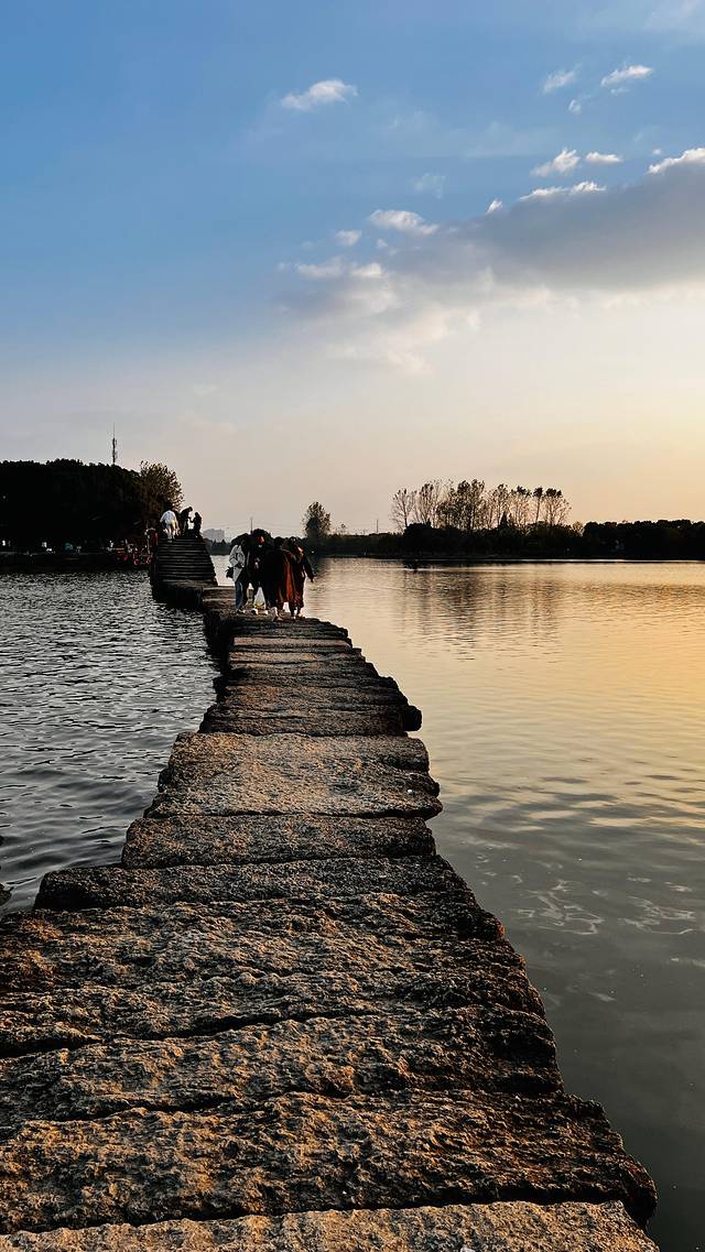 犭央犭茶湖避塘是我此行的首站。从上海自驾过去应该2个多小时,由于高速路上有点堵,到那里已是下午三点多了。漫步在古老的避塘上,脚下的石板历经岁月打磨,每一步都仿佛踏在历史的脉络上。湖水悠悠,在阳光的照耀下波光粼粼,远处的树木郁郁葱葱,与蓝天白云相映成趣。这里不仅是交通要道,更是古人智慧的结晶,静静伫立,便能感受到时光的沉淀。